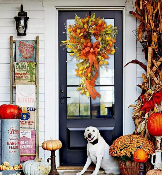 Welcome your guests with a burst of vibrant autumn hues, creating a cozy and inviting atmosphere right at your doorstep. This beautifully crafted wreath is perfect for celebrating the season.