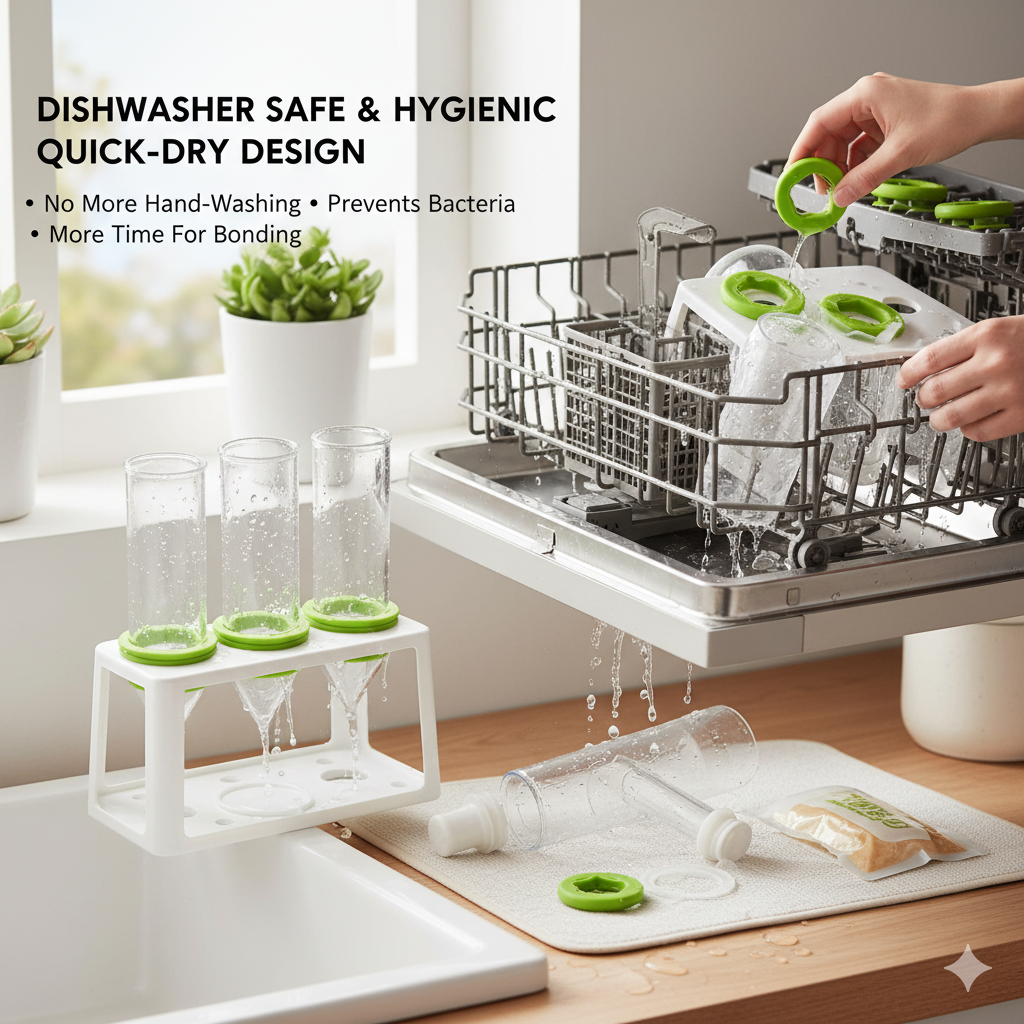 Forget hand-washing hassles! All components are top-rack dishwasher safe and feature our innovative no-trap design that prevents water pooling. The tubes dry completely without hidden moisture areas that can harbor bacteria. Spend less time cleaning and more time bonding with your little one.